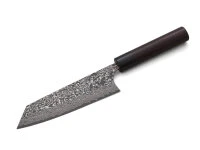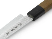 -Wert, Messgröße für die Härte des Stahls, liegt bei 61. VG-10 ist ein Edelstahl und enthält im Unterschied zu den Kohlenstoffstählen Aogami oder Shirogami ca. 15% Chrom. Die Ummantelung besteht aus 16 Lagen härterem und 18 Lagen etwas weicherem Nickel Damast, so dass Härte, Schärfe und die sinnvolle Elastizität in einem hervorragenden Verhältnis zueinanderstehen. Finish: Optisch wird die Klinge einerseits durch die Damast Lagen, andererseits – im oberen Bereich – durch das Hammering dominiert. Bevor die Klinge gehämmert wird, bearbeitet Yoshimi die Klingen-Oberfläche mit einem besonders feinen Schliff. In Test hat sich herausgestellt, dass der eckige, besondere Stil des Hammerings den Antihaft-Effekt für Schnittgut sehr gut unterstützt. Griff: Der Griff dieser Messer ist aus hochwertigem, schwarzem