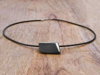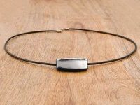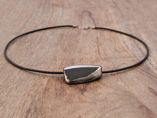Dieser außergewöhnliche Halsschmuck stammt aus den Händern von Shinobu Hashimoto, einem renommierten Keramik Künstler aus Japan. Die beeindruckenden, rustikalen Werke von Shinobu haben ihren ganz eigenen Stil. Der Anhänger besteht aus Keramik, die mit einer schönen Platin-Glasur akzentuiert ist. Ein spannender Kontrast, der vielleicht besonders Damen mit ausgeprägtem, individuellen Charakter sehr gut zu Gesicht steht.. Durch seine einzigartige Weise der Oberflächenbearbeitung wurde Shinobu weltweit bekannt und bei vielen Kennern der Keramikkunst geschätzt. Statt einer Glasur verwendet Shinobu für die Keramik Slip und erzielt damit einen „Crackle“-Effekt, der seinen Werken eine subtile Leuchtkraft und Ausstrahlung verleiht. Der Künstler unterstreicht damit die Ursprünglichkeit des Materials, akzentuiert gekonnt seinen Charakter.