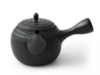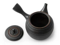 von Gyokko aus Tokoname mit integriertem Keramiksieb. Diese japanische Teekanne wurde vom Meister selbst aus natürlichem Ton von Hand auf der Töpferscheibe gefertigt. Gyokko ist einer der bekanntesten Meister dieser Kunst. Er verwendet ausschließlich natürlichen, mineralstoffreichen Ton aus Tokoname, der bei hohen Temperaturen gebrannt werden kann. Seine sehr detaillierten Muster sind oft Vorlage für Kopierversuche, was in Japan als großes Kompliment gilt. Die schöne Teekanne wiegt ca. 280 Gramm und fasst ungefähr 580 ml. Sie ist sehr gut mit den schwarzen Teeschalen von Meister Gyokko kombinierbar.