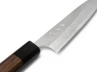 mit einer Klingenlänge von ca. 120 mm ist ein echtes Universalgenie unter den Küchenmessern. Kaum ein anderes Messer wird so oft genutzt, wie dieses Allzweck Kochmesser. Das handgeschmiedete Kochmesser ist aus Aogami Super von Yoshimi Kato gefertigt und mit dem dekorativen und auch funktionellen Finisch Nashiji (Pear Skin) versehen. Die geschnittenen Scheiben haften weniger am Messer und erleichtern die Arbeit sehr. Aogami Super ist ein Kohlenstoffstahl mit sehr hohem Schärfepotential.