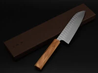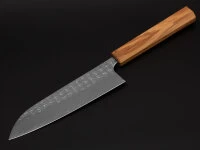 Japanisches Allzweckmesser von Yoshimi Kato, Symbiose von Schönheit und Funktionalität in einem Meisterstück. Der Griff aus italienischem Olivenholz, gewachst, achteckig geformt, liegt perfekt in der Hand. Sofort wird der Wunsch wach, die schöne, gehämmerte Klinge ihrem eigentlichen Zweck zuzuführen. Die ca. 170 mm lange Klinge, eine sehr gute Länge für das schöne Kochmesser, wurde aus SG2 Stahl gefertigt. Der renommierte Stahlhersteller Takefu Special Steel bezeichnet den Stahl als Super Gold 2 (SPG2). Es ist ein pulvermetallurgischer, rostfreier Stahl mit einigen Besonderheiten. Messer-Schmiede und Messer-Liebhaber schätzen besonders die homogene, feine Struktur, den hohen Härtegrad von 63
